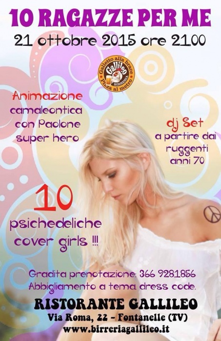 Ti possono bastare 10 ragazze? Al Gallileo, per il lancio della nuova Winter Season 2015/16, ci sono 10 psichedeliche cover girls. Mercoledì 21 arriva il party di inizio stagione all'insegna della bellezza e dei favolosi anni settanta. Nel locale si balla con il dj set che sforna grandi hit a partire dai ruggenti anni '70 e ci si diverte con la camaleontica animazione di Paolone superhero. Per rendere ancora più speciale la festa è gradito l'abbigliamento a tema: preparatevi a sfoggiare un incredibile dress code flower power vintage. Prima di scatenarsi nel party, al Gallileo (vai alla pagina Facebook) è possibile cenare con le due specialità della casa: il galletto alla brace e la pizza a metro.