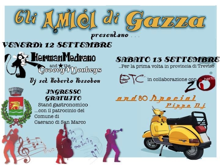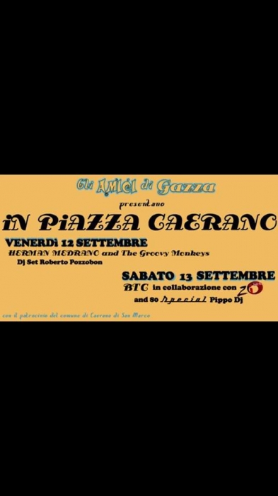 Musica, drink, street food e divertimento sono gli ingredienti del festival organizzato dagli amici di Gazza in piazza a Caerano San Marco. Si parte venerdì 12 settembre con le strepitose rime in dialetto veneto di quel fenomeno rapper che è Herman Medrano, accompagnato dai The Groovy Monkeys. A seguire c’è il dj set di Roberto Pozzobon. Sabato 13 BTC, il gruppo che ha fatto ballare la movida jesolona, in collaborazione con Zio Berto presenta 80 Special Pippo dj.