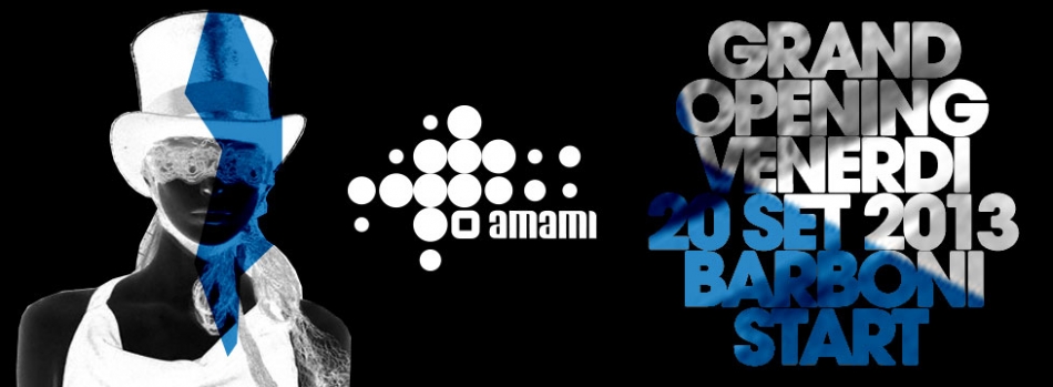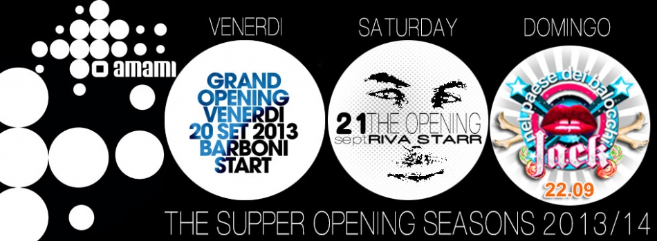 Si inizia venerdì 20 con la serata Barboni Start con in consolle Pigna, dal Pineta di Milano Marittima e di Formentera. Sabato 21 arriva Riva Starr, uno dei dj e produttori più importanti nel panorama house degli ultimi anni, italiano, anzi napoletano, ma trapiantato con successo a Londra e scelto anche da Jovanotti per aprire i concerti del "Backup tour 2013”. Domenica 22 ritorna l’appuntamento con Jack per l’aperitivo lungo più sessualmente intrigante. Per l’apertura dell’Amami, come per le successive serate, prima di scendere in pista, è anche possibile cenare nel locale.