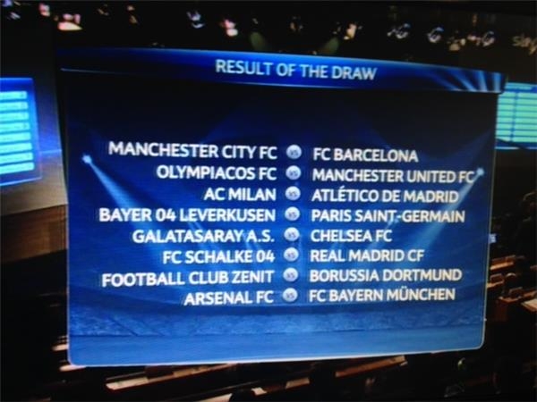 Le sfide in Champions League – Il big match sarà Barcellona-Manchester City. Una delle favorite per la vittoria finale saluterà già agli ottavi la rincorsa alla coppa dalle grandi orecchie. Bene invece è andata al Paris Saint Germain che troverà sulla sua strada il Bayer Leverkusen, benissimo all’altra compagine di Manchester, lo United, che non dovrebbe avere difficoltà a sbarazzarsi dei greci dell’Olympiakos, nonostante il pessimo periodo che sta vivendo in campionato. Arsenal-Bayern Monaco sarà probabilmente uno spettacolo di bel calcio dato l’ottimo stato di forma delle due squadre e la loro propensione offensiva. Galatasaray-Chelsea, Schalke 04-Real Madrid e Zenit-Borussia Dortmund le altre partite in programma.