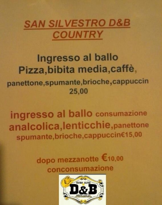 Come lo scorso anno anche il Capodanno 2013 del D&B sarà a ritmo di country. Come nel selvaggio west si attende lo scoccare della mezzanotte ballando le più belle canzoni della tradizione americana e i recenti successi del new country. Il divertimento è assicurato al D&B (vai alla pagina Facebook) con la selezione musicale proposta dalla coppia di dj composta da Mister Dj (Western Company) e dj Ettore (Country Eagles). Nel locale è possibile cenare o venire per il dopocena.