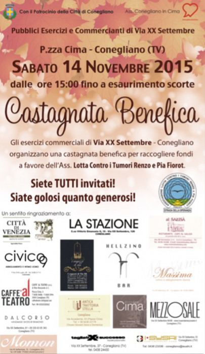Appuntamento con la generosità sabato 14 in piazza Cima. I negozi e i locali di via XX Settembre si uniscono per una buona causa: raccogliere fondi in favore dell'associazione Lotta contro i tumori Renzo e Pia Fiorot, che da 1984 si impegnan nella prevenzione e nell'assistenza domiciliare al malato di cancro. Dalle 15 fino ad esaurimento scorte, ci sarà una castagnata benefica. Siete tutti invitati: siate golosi quanto generosi.
