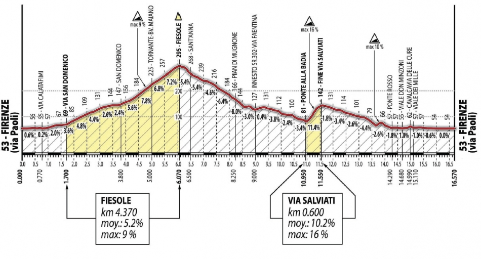 Il percorso mondiale – Tracciato duro, 272 chilometri movimentati , con un finale che sembra un elettrocardiogramma in movimento. Due i punti critici del circuito finale di 16.5 chilometri che i professionisti dovranno percorrere 11 volte: la salita di Fiesole, 4.3 chilometri con pendenza massima del 9% con annessa discesa impegnativa e veloce, e lo strappo secco e infido di via Salviati, 600 metri con la strada che arriva sino al 16% di pendenza. Da lì un falsopiano lungo cinque chilometri di sofferenze, speranze, inseguimenti e sogni di gloria. Non bastasse questo la partenza si terrà a Lucca, da lì 106 chilometri di pianura per arrivare a Firenze con in mezzo lo strappo di Montecarlo, 3.7 chilometri al 3.5% con pendenze massime del 9%, ovvero niente di impossibile, e quello del San Baronto, versante di Laporecchio, quello duro, quello che ogni anni crea la selezione decisiva al Gran Premio Industria e Artigianato, storica corsa in linea che si disputa a maggio pochi giorni prima dell’inizio del Giro d’Italia. Sono 3.9 chilometri che si inerpicano sino a toccare pendenze dell’11%: strada stretta e possibili imboscate. Farsi trovare impreparati a questo punto della gara vorrebbe dire sprecare energie per inseguire i fuggitivi, energie che invece serviranno nell’ultima parte del percorso, come ha sottolineato più volte il ct azzurro Paolo Bettini a corridori e giornalisti.