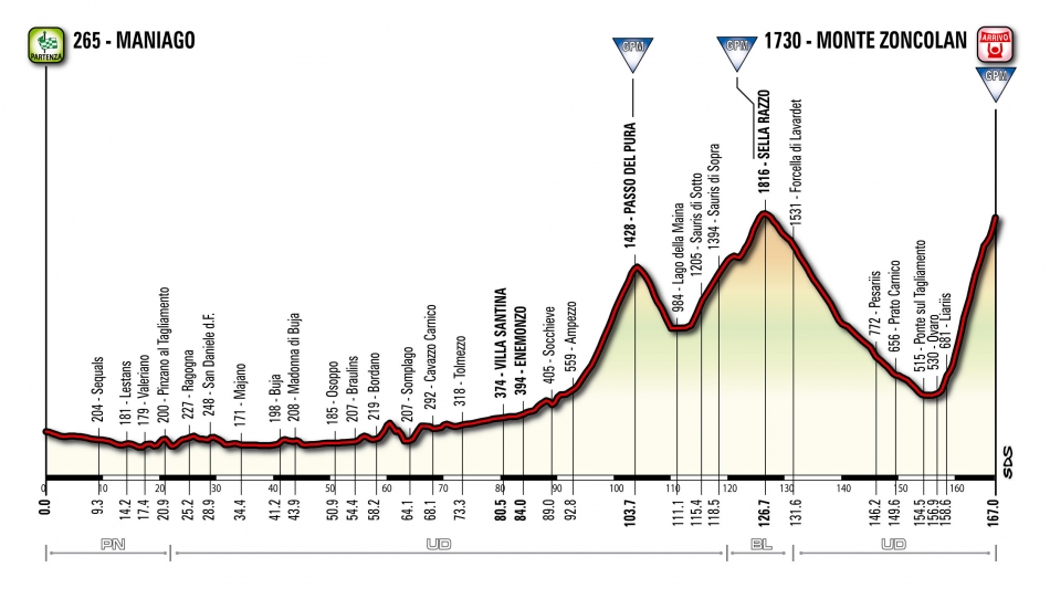 Le ultime salite – La tappa di Val Martello l’anno scorso era saltata per neve. Nessun problema, si recupera. Ecco ancora Gavia e Stelvio, prima dell’ultima ascesa. La speranza è che il tempo regga; lo spettacolo è invece assicurato. Ed ecco il gran finale. Prima il Giro toccherà il coneglianese, arrivando a Vittorio Veneto dopo aver scalato il Muro di Ca’ del Poggio. Tappone dolomitico con San Pellegrino e Redebus prima della salita che porta al rifugio Panarotta alla 18° tappa, cronoscalata al Monte Grappa alla terzultima tappa e Zoncolan alla penultima. Tre inferni in tre giorni, tre fantasmi da scacciare, da scalare, da domare. Qui si deciderà il Giro. Qui si saprà chi metterà il proprio nome sul Trofeo Senzafine, chi sarà l’ultima e definitiva maglia Rosa.