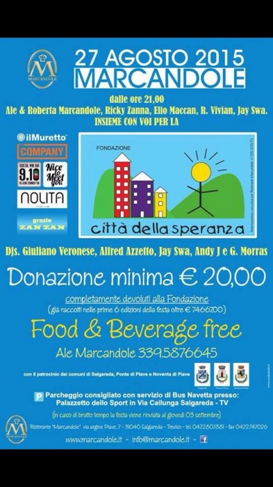 Al ristorante Marcandole di Salgareda torna l’appuntamento con la solidarietà giovedì 27. Ti aspetta una serata per raccogliere fondi per la fondazione Città della Speranza (vai al sito) che sostiene la clinica di oncoematologia pediatrica di Padova. Per partecipare è sufficiente una donazione minima è di 20€, che verranno totalmente devoluti. Alle Marcandole (vai alla pagina Facebook) ci saranno prelibate degustazioni food and beverage gratuite e in consolle si alterneranno i dj Giuliano Veronese, Alfred Azzetto, Jay Swa, Andy J. e G. Morras. Tra i partner dell’evento c’è anche il Gallileo (vai alla pagina Facebook).