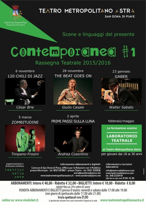 Per chi vuole godersi i nuovi linguaggi del teatro San Donà prepara una rassegna più Contemporanea. 5 appuntatemi dove la musica e le parole si fondono, come negli spettacoli Walter Sabato dedicato a Giorgio Gaber e di Giulio Casale, leader della band trevigiana degli Estra, ispirato a Kerouac e alla beat generation. C'è il racconto della notte del 20 luglio del 1969 quando l'uomo mosse i primi passi sulla luna e l'horror degli zombie, presentato all'ultima edizione di Roma Europa Festival. Si parte 6 novembre con 120 chili di jazz, monologo dell'argentino Cesar Brie sull’avventurosa storia di Ciccio Méndez, disposto a tutto per amore di una donna, del jazz e di un Texas hamburger. Prima o dopo lo spettacolo ci si può trovare a due passi dal teatro da Venetino (vai alla pagina Facebook). Nel locale si può gustare una selezione di vini veneti di qualità, dal Prosecco ai rossi veronesi, e di spumeggianti birre artigianali.