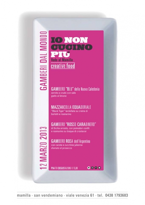 Alzi la mano chi ha mai mangiato il gambero blu della Nuova Caledonia o le mazzancolle “Black Tiger” che vengono dalle zone equatoriali. Se siete a caccia delle delizie che vengono dal mare mercoledì 12 marzo al Mamilla (vai alla pagina Facebook) troverete delle sorprese belle e buone. L’appuntamento Creative Food presenta squisiti gamberi da tutto il mondo dalla Sicilia all’estremo Oriente, dall’Oceania all’Argentina da assaporare all’aperitivo, magari in un invitante piatto da condividere con gli amici, o da gustare in una cena da leccarsi i baffi. Il piatto degustazione è proposto a 15€ ed è possibile prenotare chiamando il numero: 0438 1793683.