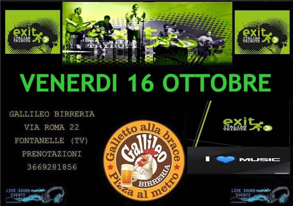Arriva al Gallileo la Exit Band Italian Tribute con il suo repertorio vasto e variegato. Venerdì 16 preparatevi ad un viaggio sonoro che passa attraverso il meglio del pop rock made in Italy da Vasco Rossi a Zucchero, da Luciano Ligabue ai Negrita, dai Negramaro a Biagio Antonacci. Il tributo alla miglior musica italiana degli ultimi anni sarà come sempre coinvolgente, divertente, elegante ed aggressivo allo stesso tempo con una interpretazione esplosiva. Prima del concerto al Gallileo (vai alla pagina Facebook) è possibile cenare con le due specialità della casa: il galletto alla brace, in versione classica o piccante, e la pizza a metro disponibile in tantissime sfiziose combinazioni di gusti.