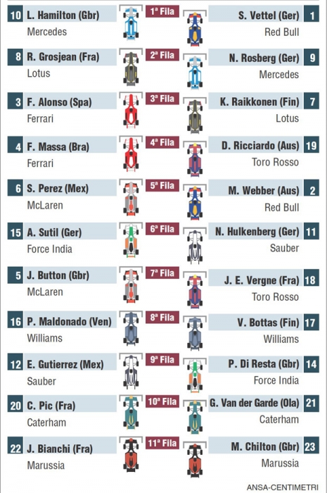 Fine settimana nero invece per le Ferrari. Alonso chiude con il quinto posto una gara incolore che non lo ha mai visto lottare con i migliori. Finisce a oltre mezzo minuto e in fase di difesa dagli attacchi del francese Grosjean, autore di una grande gara condita però dalla la solita irruenza e penalizzata da un drive-through conseguenza del taglio di chicane con il quale si è avvantaggiato nel sorpasso di Button. Alonso chiede miglioramenti; sa benissimo infatti che per lottare per il titolo ha bisogno di innovazioni radicali che rendano di nuovo competitiva una vettura che è diventata appena la quarta forza del campionato.