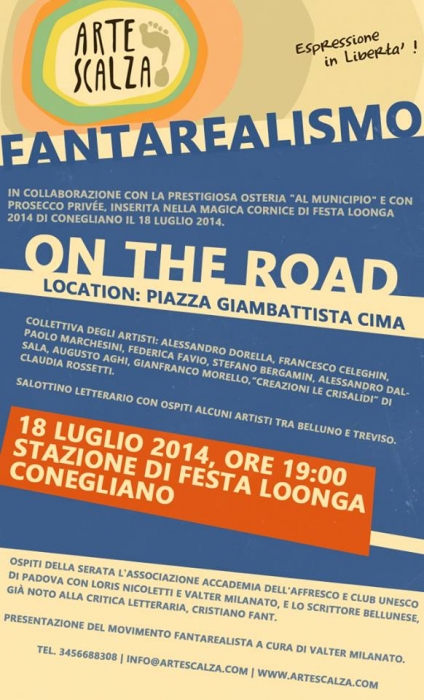 Il Fantarealismo è un movimento artistico che racchiude in sè tutte le dinamiche della poesia artistica del nuovo millennio: la ricerca continua di comunicare. Il percorso fantarealista è formato da “stazioni”, ognuna delle quali rappresenta una tappa artistica del movimento, e corrisponde ad un locale o luogo aderente al progetto, mediante l’esposizione delle opere degli artisti fantarealisti. Venerdì 18 dalle 19 la stazione prescelta è piazza Cima in un evento in collaborazione con il Municipio (vai alla pagina Facebook) e Prosecco Privée. Esporranno in una mostra collettiva gli artisti: Alessadro Dorella, Francesco Celeghin, Paolo Marchesini, Federica Favio, Lando Roberto, Simone Berno, Paolo Ziliotto, Stefano Bergamin, Alessandro Dalsala, Augusto Aghi e le crisalidi di Claudia Rossetti.