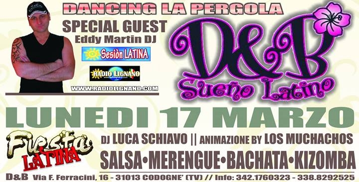 Ritorna al D&B dj Eddy Martin per far scatenare ancora una volta la fiesta latina. Lunedì 17 nel locale si balla con i calienti ritmi del Sud America mixati dal deejay di Radio Lignano e della Sesion Latina. Il sound spazia dalla salsa alla bachata, dal merengue alla kizomba, passando per la musica cubana e portoricana. Sarà una vera anticipazione dei balli dell’estate che ormai è alle porte... Durante la stessa serata al D&B (vai alla pagina Facebook) in consolle ci sarà anche dj Luca Schiavo e l’animazione dei Los Muchachos. Prima di scendere in pista si può cenare nella pizzeria e gustare le strepitose pizze cotte nel forno a legna.