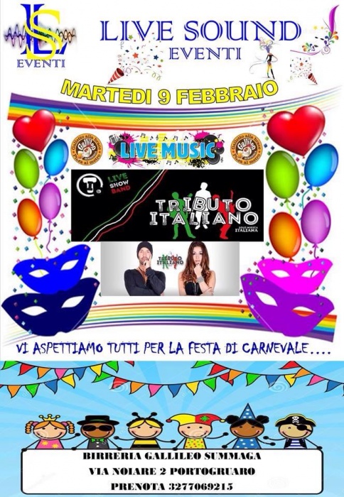 Sei pronto a scatenarti per il gran finale del Carnevale? Allora viene a festeggiare martedì grasso al Gallileo di Sumamga. A movimentare la serata c'è la musica dal vivo con il Tributo Italiano: le più belle e divertenti canzoni italiane dagli anni '60 ai giorni nostri. Prima del concerto al Gallileo di Summaga (vai alla pagina Facebook) è possibile cenare e non si fanno scherzi sul mangiare. Ci saranno da gustare le due squisite specialità della casa: il galeltto alla brace, in versione classica o piccante, e la pizza a metro, disponibile in tantissime combinazioni di gusti. Per informazioni e prenotazioni: 327 706 9215