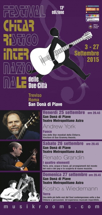 Appuntamento imperdibile per chi ama il suono della chitarra. A San Donà da venerdì 25 a domenica 27 c'è il finale del Festival chitarristico internazionale delle due città, dopo le tappe di Roma e di Treviso. Si potranno ascoltare i concerti di Andrew York, una star mondiale della chitarra, vincitore di ben due Grammy Awards, del duo Kosho e Wiedemann, composto da una delle più belle voci suol contemporaneo sostenuta da chitarre e percussioni, e di Renato Grandin che presenta quattro arrangiamenti di pezzi storici dal mondo del rock e del pop. Gli spettacoli si svolgono alle 20.45 al Teatro Metropolitano Astra, a due passi da Venetino (vai alla pagina Facebook). Prima o dopo il concerto ci si può trovare nel locale per gustare un delizioso aperitivo con vini di qualità, come il Prosecco e i vini veronesi, le spumeggianti birre artigianali e i cocktail.