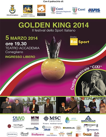 Dopo il successo dell’edizione 2013 torna a Conegliano il festival dello sport italiano. Mercoledì 5 marzo all’Accademia di Conegliano è Golden King, la notte degli oscar con i protagonisti dell’ultima stagione sportiva. Sul palco del teatro Accademia saliranno 8 campioni per ricevere le preziose statuette Golden King. Tra loro ci saranno il pugile campione del mondo e campione olimpico Roberto Cammarelle ed Armin Zoeggeler, la leggenda dello slittino che alle olimpiadi invernali di Sochi ha appena vinto la sesta medaglia olimpica partecipando a 6 edizioni dei giochi. Ospite della serata è la cantante Cixi, quarta classificata a X Factor 2012.