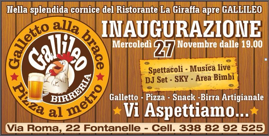 Vieni a scoprire la nuova birreria Gallileo mercoledì 27 novembre nella giornata di apertura. Il locale rinnova lo storico ristorante la Giraffa a Fontanelle, proponendo uno stile e una cucina completamente diversi. I capisaldi di Gallileo saranno il galletto alla brace e la pizza al metro, oltre alle birre artigianali e ai classici snack. E poi nel dopocena ci saranno spettacoli, le partite di calcio in tv, concerti, dj set, un’area bimbi, una arena estiva e tanto divertimento...