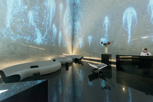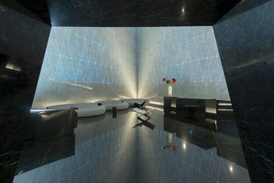 I Restaurant & Bar Design Awards sono gli oscar dell’estetica applicata alla ristorazione. Da 5 anni costituiscono il premio più ambito per gli architetti e gli arredatori dei locali. Quest’anno è stato incoronato miglior design bar del 2013 l’Atrium Champagne Bar, disegnato nientemeno che dall’archistar Norman Foster e dal suo studio (vai al sito). Il bar, anche se è veramente riduttivo definirlo così, sarebbe piaciuto a Tutankamon. E’ creato all’interno di una spettacolare piramide alta nove piani che termina con un lucernario triangolare. La luce filtra dall’alto e da vita a sorprendenti giochi di luce che si riflettono sulle pareti di marmo bianco lucido e sul pavimento in granito nero lucido.