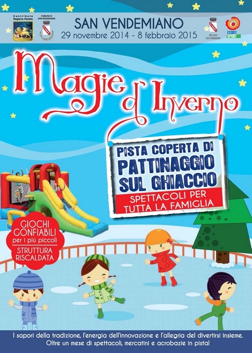 La pista di pattinaggio di San Vendemiano è nel piazzale antistante il Municipio e sarà aperta fino all’8 febbraio. A contorno ci sono gli eventi della manifestazione Magie d’Inverno come Aspettando il Natale in dolcezza domenica 21 dicembre con Leonardo di Carlo, campione del mondo di pasticceria, direttamente dal programma di Rai 2 "il più grande pasticciere" e sabato 27 con i concerti di Winter Stage.