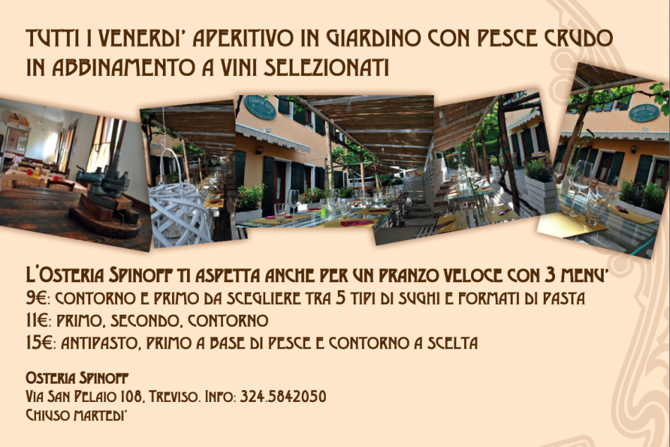 Con l’arrivo della bella stagione all’Osteria Spinoff (vai alla pagina Facebook) si può pranzare anche all’aperto nell’incantevole giardino estivo che è stato appena ultimato. Inoltre tutti i venerdì c’è l’aperitivo con pesce crudo in abbinamento a vini selezionati.