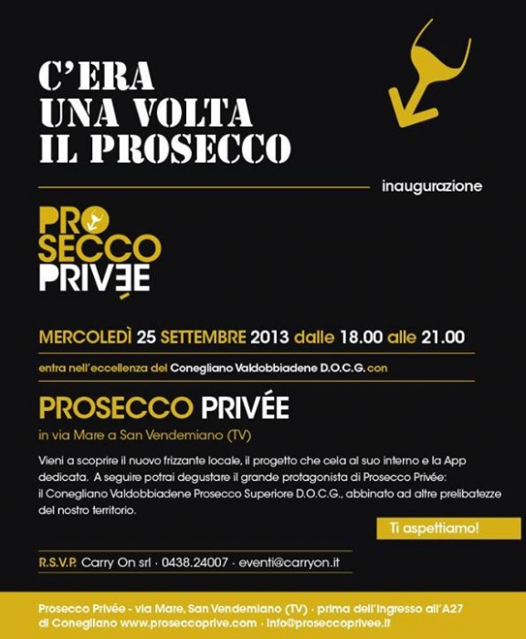 Prosecco Privée è una nuova iniziativa, creata per far conoscere ed apprezzare ancora meglio il Conegliano Valdobbiadene Prosecco Superiore D.O.C.G. Diventerà presto il luogo privilegiato per la sua degustazione, magari in abbinamento alle altre eccellenze del territorio, fornite da piccoli produttori locali. Mercoledì 25 è l’occasione giusta per scoprire Prosecco Privée, approfittando dell’inaugurazione a libero accesso dalle 18 alle 21. La location è a San Vendemiano, in via mare 87 (poco prima dell'ingresso di Conegliano dell'autostrada), nel cuore della zona storica di produzione.