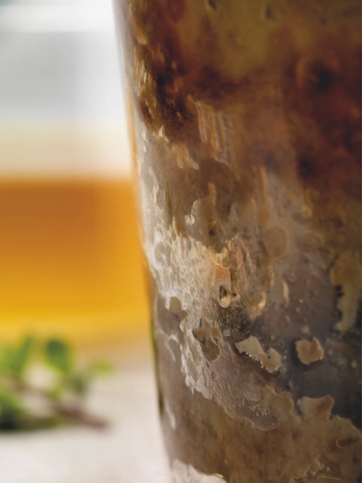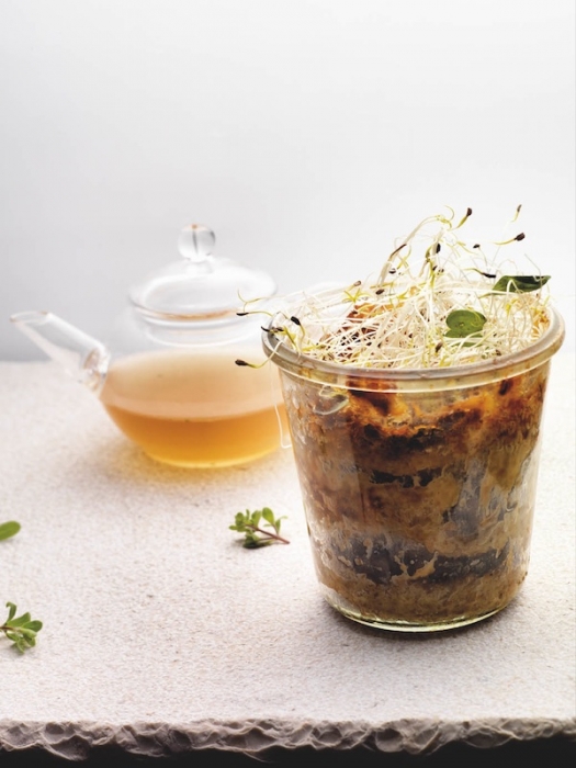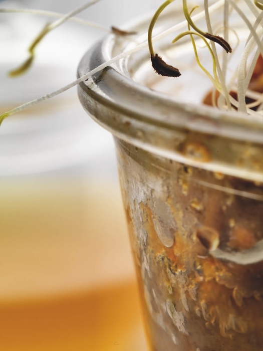 Aprire il vaso e servire al tavolo accompagnato da una teiera con il brodo e i germogli di finocchio.