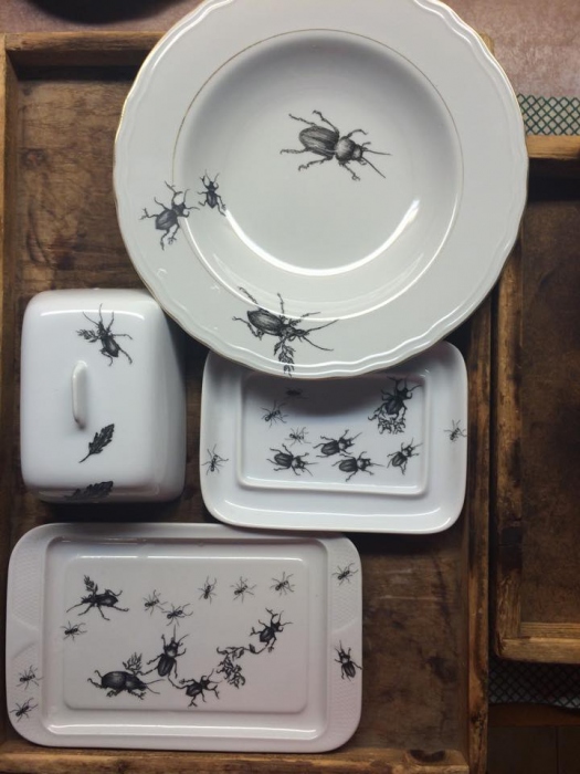 Shameless è una collezione brulicante di scarafaggi, cavallette, formiche e fiori che animano le porcellane vintage, trasformate in pezzi unici e ironici dalle mani di Elena Borghi (vai alla pagina Facebook), ben lontani dalle delicate decorazioni tipiche della nobile tradizione ceramistica. Insetti come spudorati protagonisti, coraggiosamente, rivendicano la propria bellezza in una tavola tutt’altro che simmetrica.