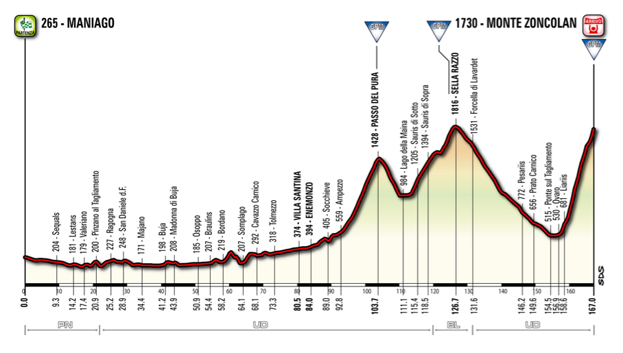 20a tappa: Maniago-Monte Zoncolan, 167km. È l’ultima chiamata, la salita più dura d’Europa, l’ultimo test. Potrebbe essere guerra totale o un’apoteosi rosa. Sarà sicuramente battaglia. Tappa tutta su e giù, prima le colline delle pre-Prealpi, poi le Prealpi dure e cattive del Friuli, Passo del Pura, 11 km a oltre il 7% con un tratto durissimo a metà ascesa nel quale la strada non va mai sotto l’8 e il 9%. Poi le Alpi, prima tenui, Sella di Razzo, infine terribili: Monte Zoncolan. Basta il nome. Qui si deciderà tutto, dopo un Giro duro e complicato può succedere di tutto.