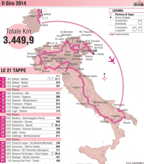 Il Giro riparte da Giovinazzo e finalmente si fa interessante. I tre giorni in Irlanda sono stati paesaggisticamente bellissimi, ma hanno detto ben poco se non poche evidenze: Kittel è il velocista più forte al Giro, la Orica GreenEdge va forte a cronometro, le cadute nelle prime tappe sono all’ordine del giorno. Insomma nessuna novità. Anzi, una sì: Daniel Martin è già fuori dai giochi, fatale gli è stata la caduta durante la prima tappa, la cronosquadre di Belfast.