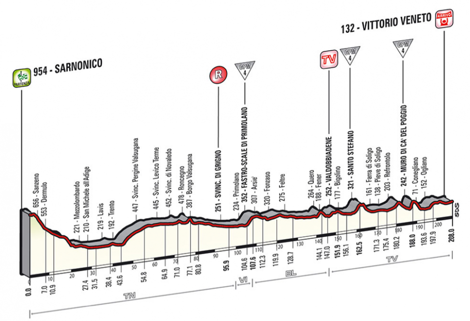 17a tappa: Sardonico-Vittorio Veneto, 208 km. Velocisti? Non è detto. È tappa da fuga, di pianura ce n’è poca, il finale poi è più complicato di quello che l’altimetria non dice. La pianura non esiste.
