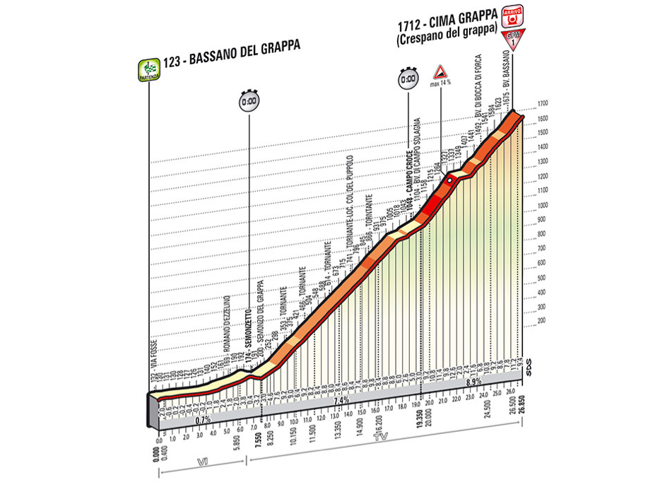 19a tappa: conoscalata al Monte Grappa, 26,8 km. Qui si decide molto. 26 chilometri d’ascesa, tratti al 14%, il tutto da percorrere con ritmo regolare. Andare in crisi qui vuol dire lasciare sull’asfalto minuti. Cronometro bellissima.