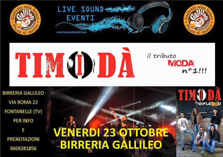 Mentre i Modà sono in studio di registrazione in questi mesi per dare alla luce il nuovo attesissimo album “Passione maledetta” al Gallileo arriva il loro tributo numero 1. Venerdì 23 nel locale suonano i Timodà, band che da diversi anni gira l'Italia riproponendo le splendide canzoni di Kekko e soci. La somiglianza vocale del cantante Phil Grandini con il leader dei Modà è davvero strepitosa. La serata vi farà ripercorrere le loro più belle canzoni con grande energia e passione. Prima del concerto al Gallileo (vai alla pagina Facebook) è possibile cenare con le due specialità della casa: il mitico galletto alla brace, in versione classica o piccante, e la pizza a metro in tantissime squisite combinazioni di gusti.