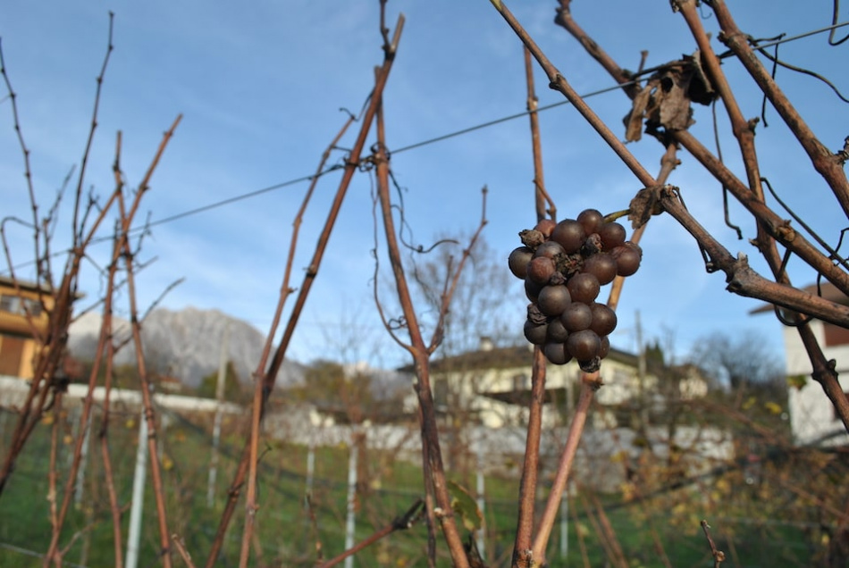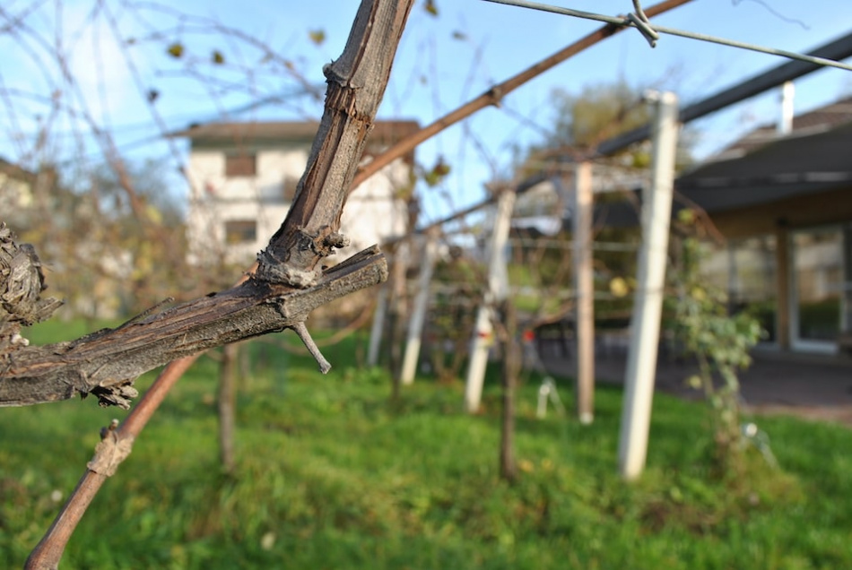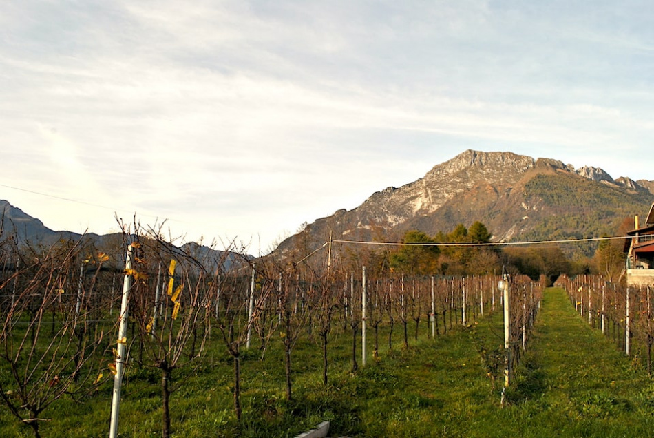Ha scelto come varietà il Pinot grigio e il Pinot nero, per la capacità di sopportare un clima più rigido. Facendo una potatura tardiva riesce a prevenire le possibili gelate primaverili. D'estate la maggiore escursione termica tra giorno e notte che si registra in questa zon arricchisce i profumi dei vini. Il terreno morenico, inoltre, è particolarmente vocato. È quello che rimane di un antico ghiacciaio che ha lasciato dietro di sé terra e ciottolato di grosso formato. Questo substrato dà ai vini una caratteristica mineralità e sapidità. I vigneti si estendono per due ettari, alle pendici del Monte Dolada che si staglia sull'orizzonte, alzando lo sguardo dai filari. Con una piccola produzione, intorno alle 6.000 bottiglie, la gestione del vigneto è molto attenta sia nel diradamento sia nella cura dei grappoli per mantenerli sempre sani e ventilati.