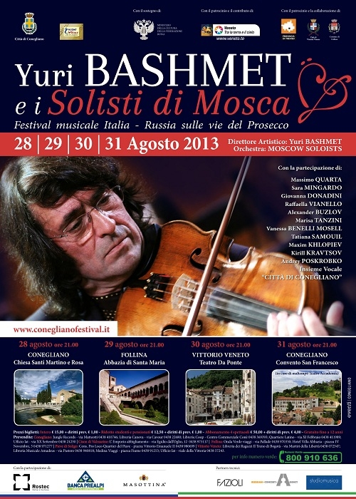 Paganini non ripete, Yuri Bashmet si. Il più grande violinista vivente sarà a Conegliano per un doppio spettacolo mercoledì 28 agosto alla chiesa dei Santi Martino e Rosa e sabato 31 al convento di San Francesco. Ad accompagnarlo ci saranno anche 25 musicisti che fanno parte dello straordinario ensemble “I solisti di Mosca’”, l’insieme vocale “Città di Conegliano” diretto da Laura Fabbro e altri musicisti italiani di grande fama. L’evento è inserito all’interno del programma del neo nato “Festival Musicale Italia – Russia sulle vie del prosecco” che comprende altri due concerti il 29 agosto all’abbazia di Follina e il 30 agosto al Teatro da Ponte di Vittorio Veneto. Vista la posizione delle location dei concerti di Conegliano, prima o dopo degli spettacoli, ci si può trovare al Caffè Teatro (vai alla pagina Facebook) per un brindisi sulla via del Prosecco, anche nei tavoli in Piazza Cima approfittando delle belle serate di fine estate.